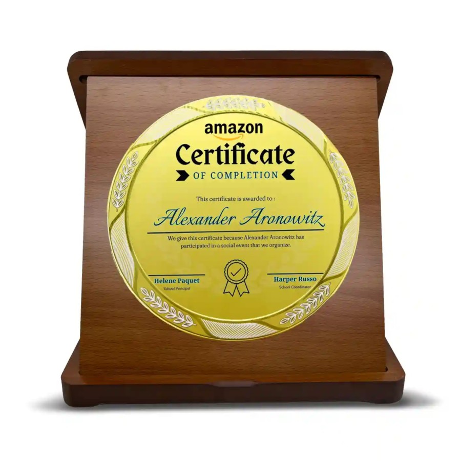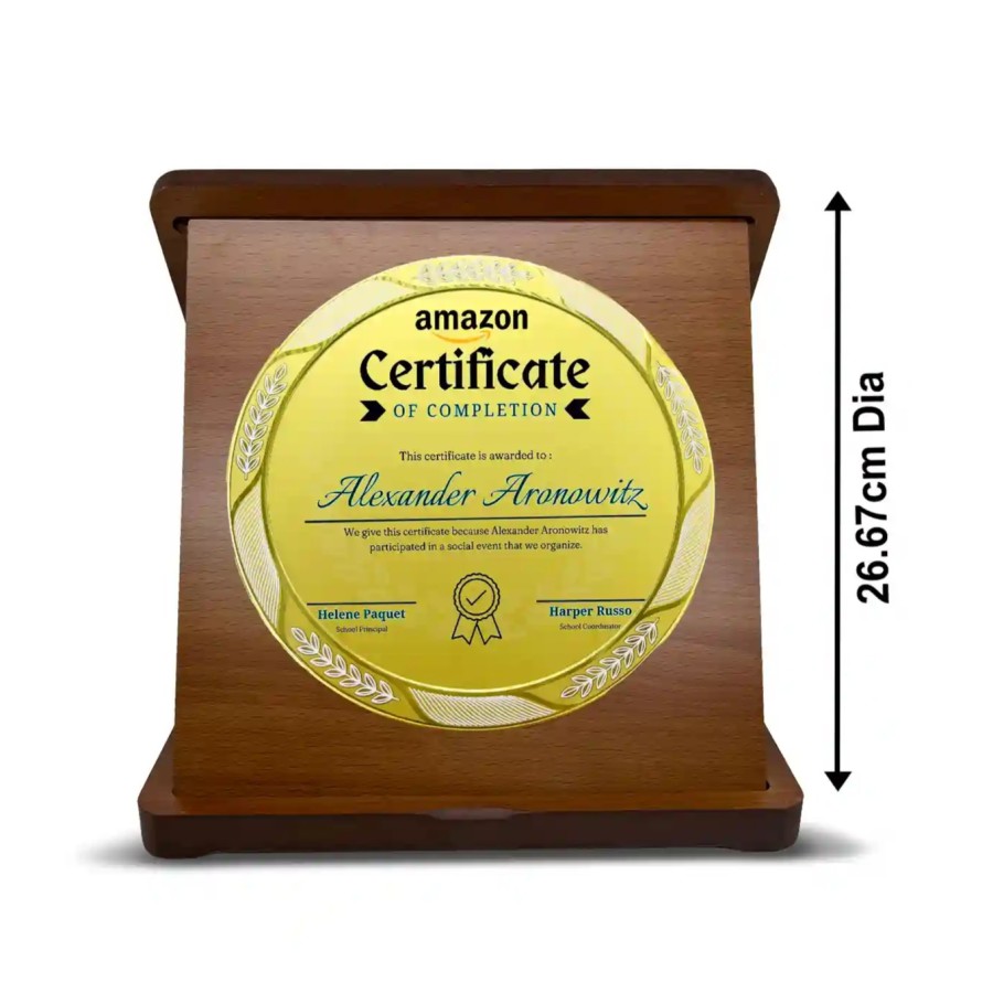 Acknowledge perseverance and hard work with Presto's Top-Quality Customized Corporate Round Wood and metal Memento. This round metal crest is encased in a genuine hardwood foldable box and personalised with your brand name, logo, and other details. This trophy is embellished with metal and is a stunning award that truly celebrates hard work and excellence.