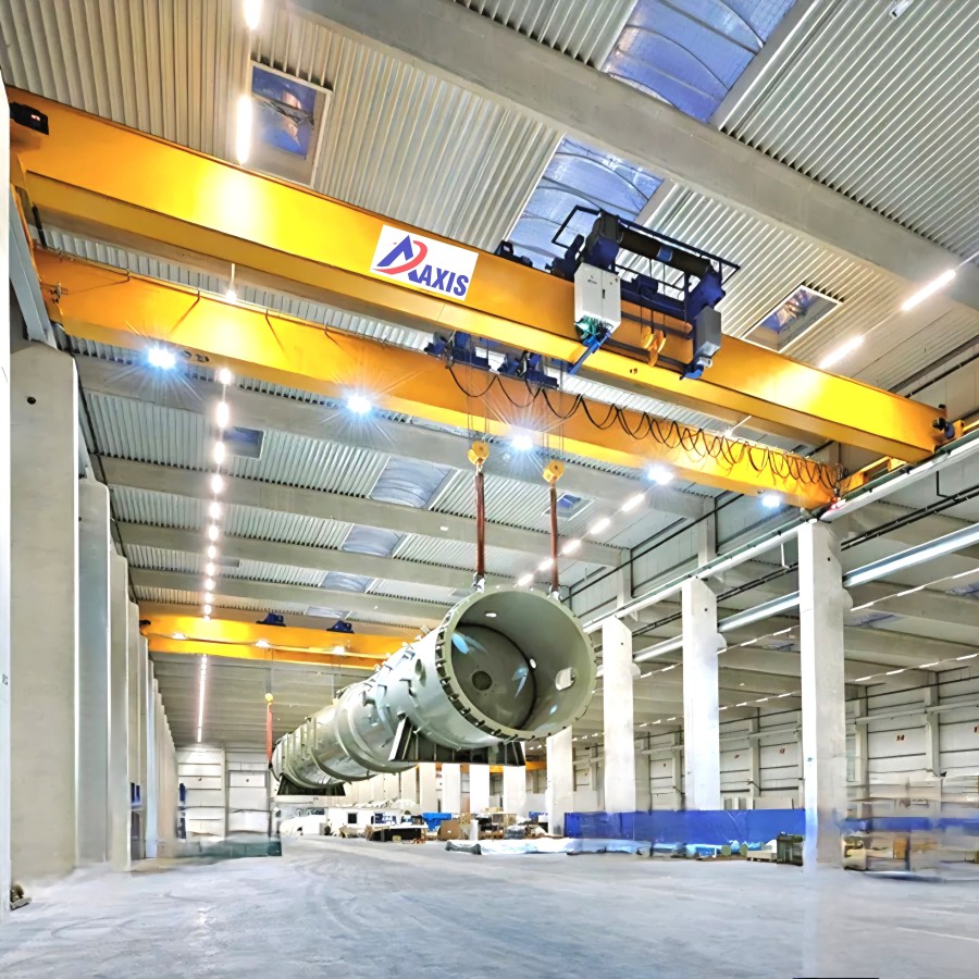 A Double Girder EOT crane is an industrial overhead crane with two main bridge beams (girders) that support a trolley carrying the hoist and lifting mechanism. This robust design allows for lifting heavier loads and offers greater hook height compared to single girder cranes, making it suitable for production duty, heavy machinery, large warehouses, shipping ports, and manufacturing sectors. The double girder structure enhances stability and provides space for features like maintenance platforms and operator cabins.