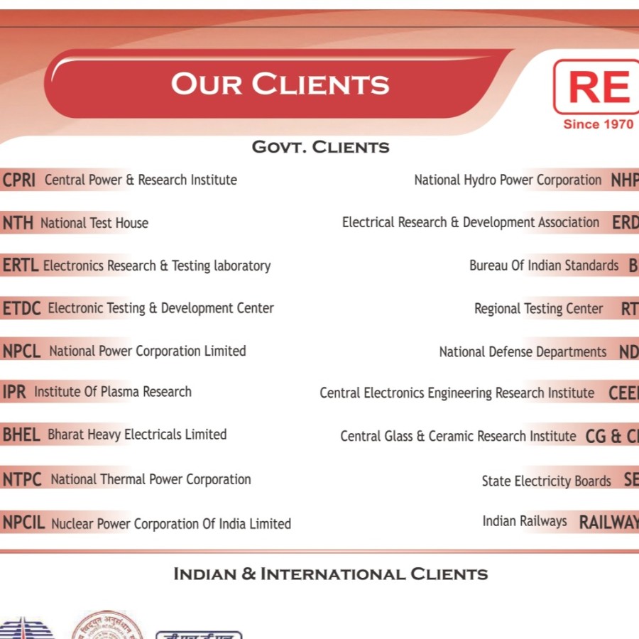 BHEL CPRL,NTPC,BARC,NHPC,CEERI , ELECTICAL INDUSTARY ELECTRICITY BOARDS, NAVY, AIR FORCE DMRC,TATA POWER etc.