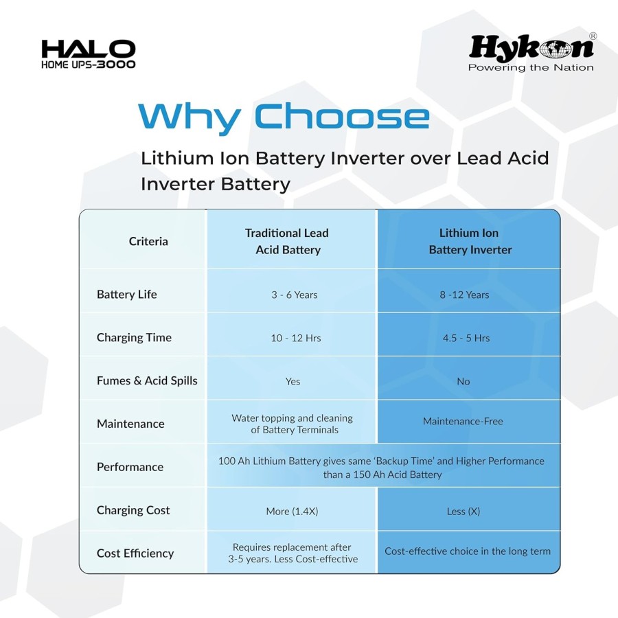 Hykon Halo Inverter, is a cutting-edge energy solution designed to provide exceptional performance, efficiency, and environmental benefits. With its inbuilt Lithium Ferro-Phosphate (LiFePO4) battery, the Halo inverter offers a modern alternative to traditional tubular batteries, ensuring a healthier, fumes-free environment for both homes and offices.