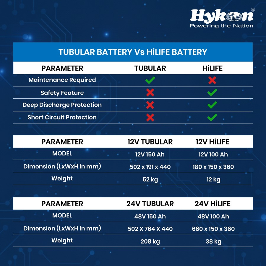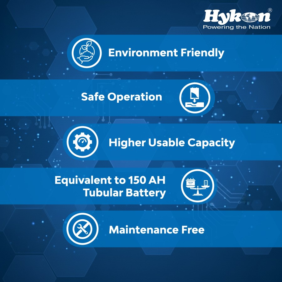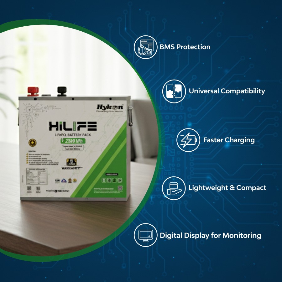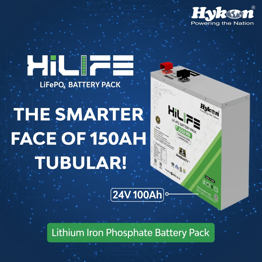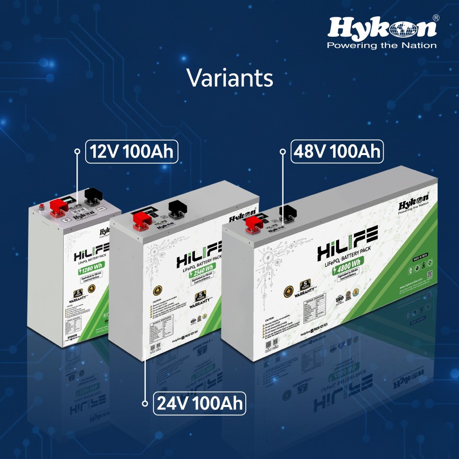 LFP batteries offered by Hykon for various applications are HiLIFE LifePO4 batteries for inverters, 2 Series, 3 Series and 4 Series batteries for Electric Vehicles, SOLI Series for solar street lights, SAFE Series for standby applications, LIFE Series for Solar Inverters, RACKO Series for UPS, TELE Series for Telecom applications, and GRANDO Series for Industrial applications.