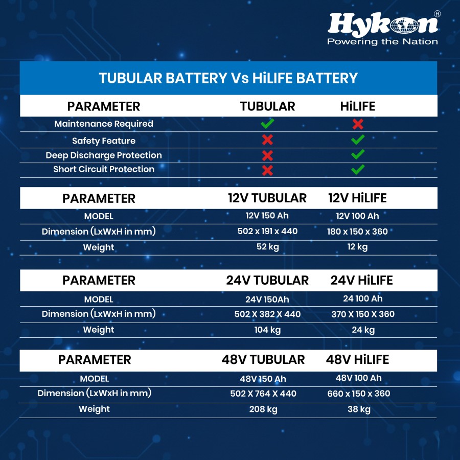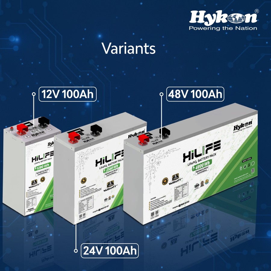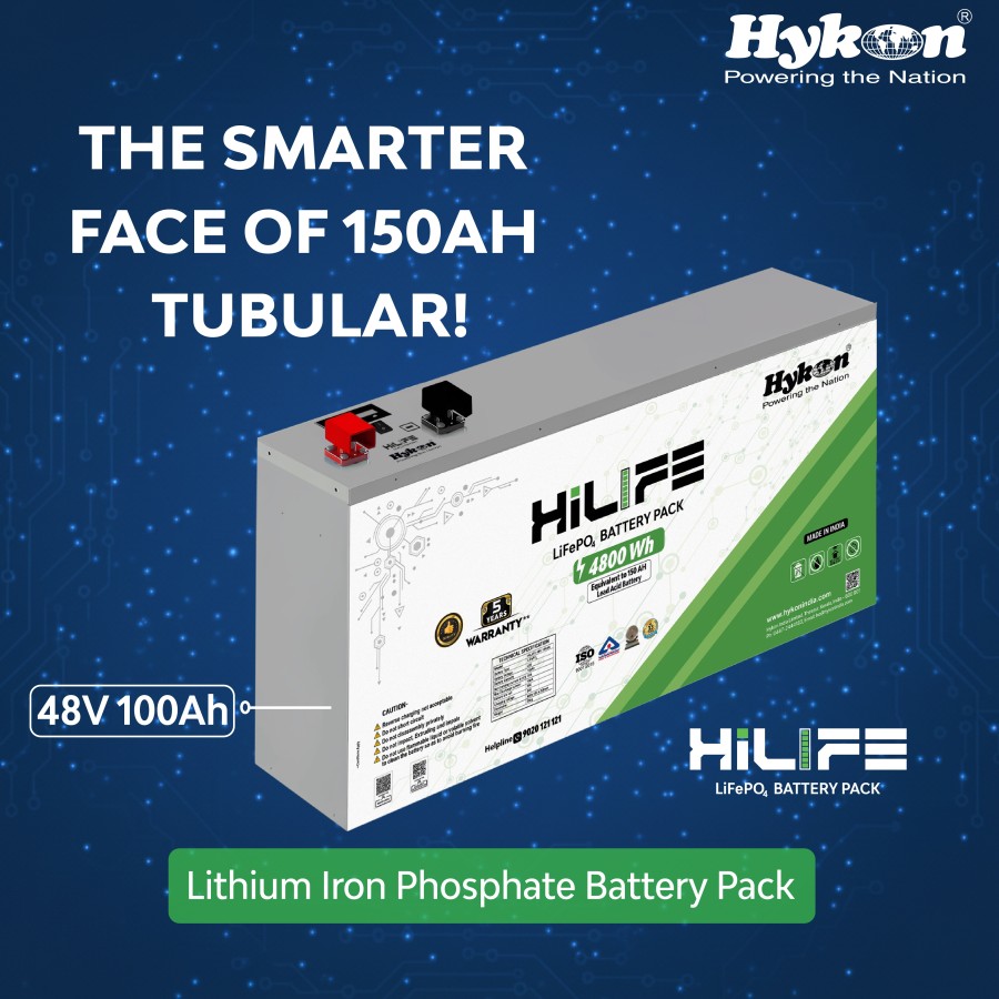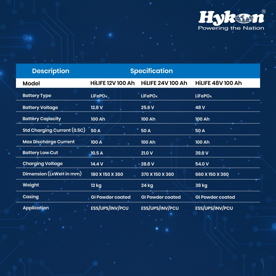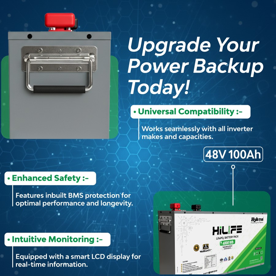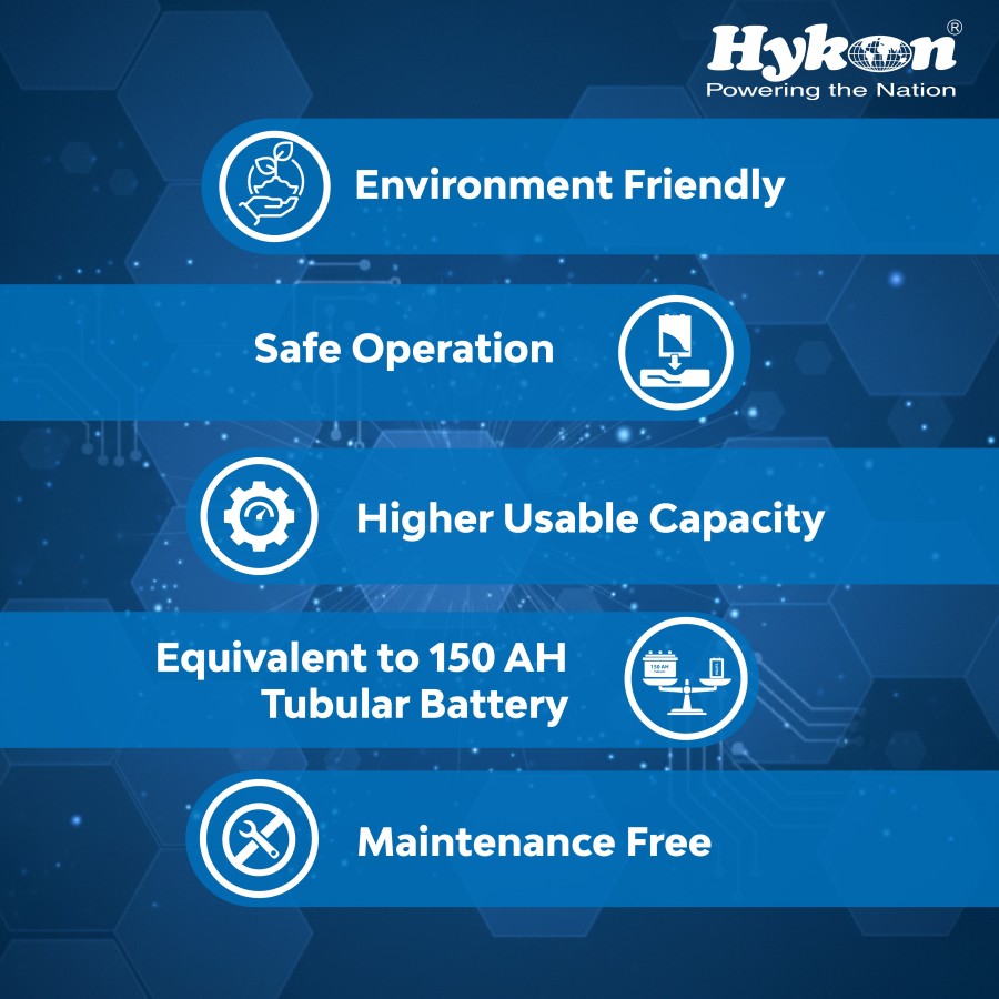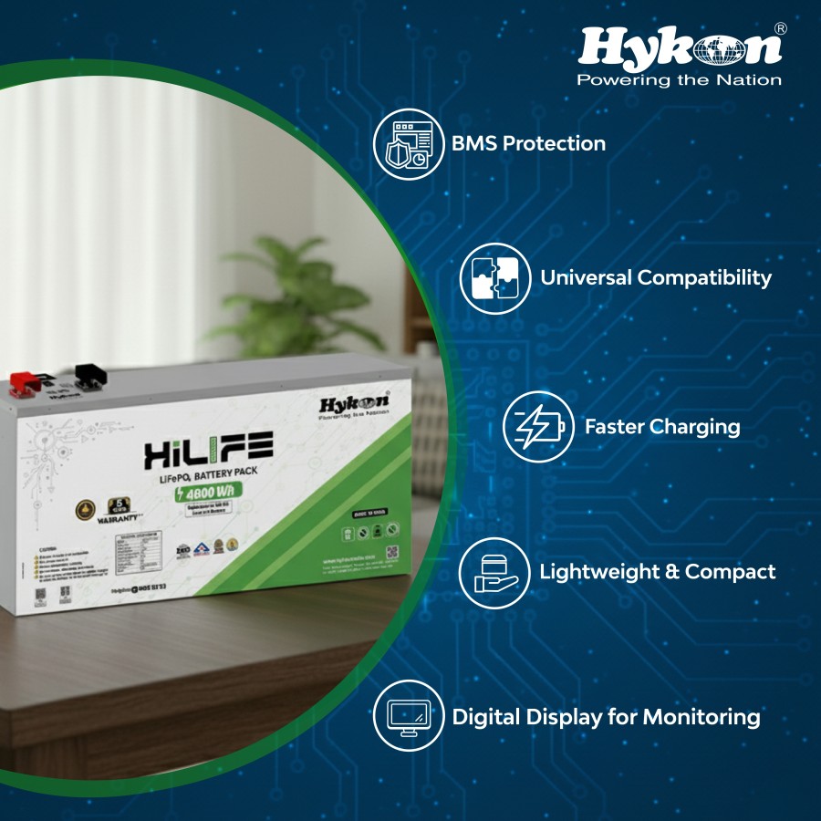 The Hykon HiLIFE ensures universal compatibility with all inverter makes and capacities and comes equipped with an inbuilt BMS for enhanced safety and prolonged lifespan. Enjoy the benefits of a maintenance-free and environmentally friendly battery that provides higher usable capacity and features deep discharge and short circuit protection. With a 5-year warranty, the Hykon HiLIFE 48V 100Ah battery is the ideal choice for a reliable and efficient power backup system.